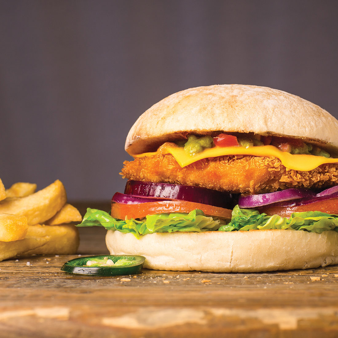 Een knapperige bite! Goudbruine, malse kip met USA cheddar cheese, frisse sla, tomaat, ui en augurk. Afgetopt met guacamole en salsa.