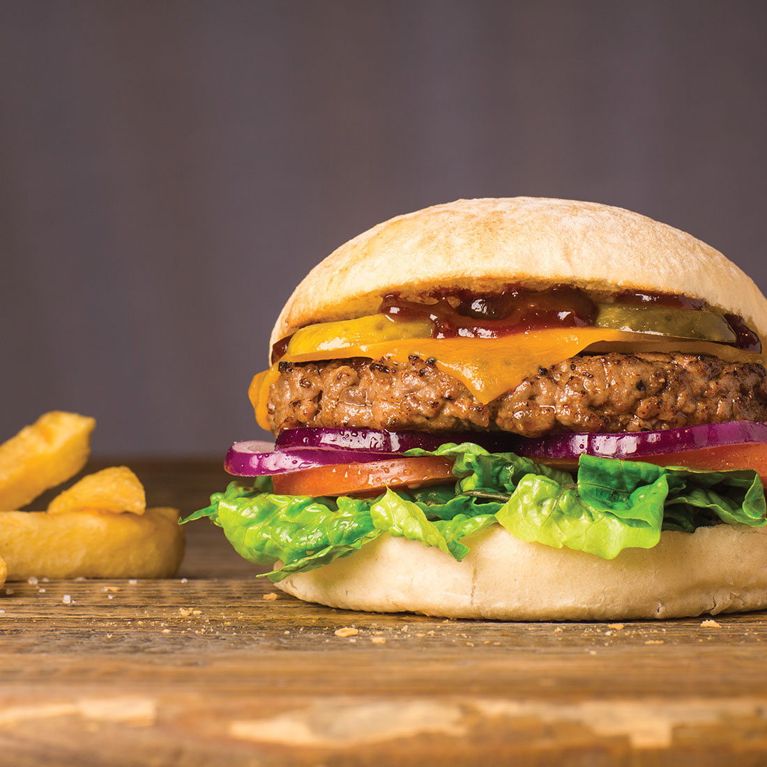 Geserveerd met frites en sla. Met Romeinse sla, USA cheddar cheese, tomaat, ui, augurk, mayo en BBQ-saus.