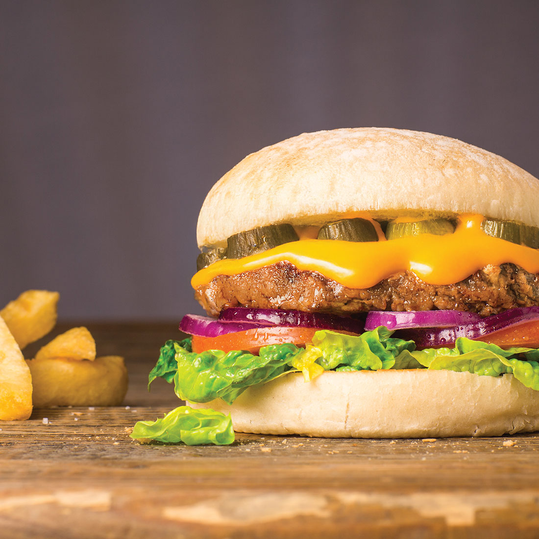 Smeuïge melted USA cheddar cheese die rijkelijk over de burger vloeit, gecombineerd met frisse Romeinse sla, tomaat, ingelegde ui en augurk.
