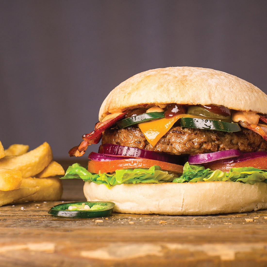 Met verse Jalapeño pepers en knapperig gebakken bacon en een hete saus. Romeinse sla, USA cheddar cheese, tomaat, ui, augurk en BBQ-saus.
